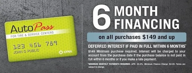 DEFERRED INTEREST IF PAID IN FULL WITHIN 6 MONTHS* $149 Minimum purchase required. Interest will be charged to your account from the purchase date if the purchase balance is not paid in full within 6 months or if you make a late payment. *MINIMUM MONTHLY PAYMENTS REQUIRED. APR: 28.8%. Minimum Finance Charge: $2.00. CFNA reserves the right to change APR, fees and other terms unilaterally.